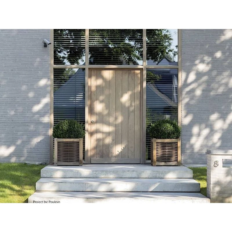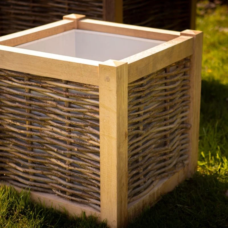 La jardinière en chêne avec tressage horizontal en bois de noisetier allie parfaitement la noblesse du chêne pour sa structure et l’authenticité du noisetier tressé pour ses panneaux.